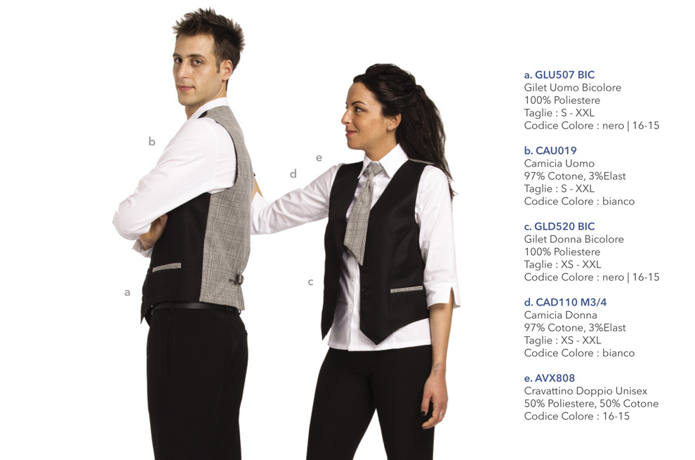 Gilè uomo donna in linea con l'ultima tendenza. Un abbigliamento professionale per ristorante trattoria del centro cittadino o del lungo mare.