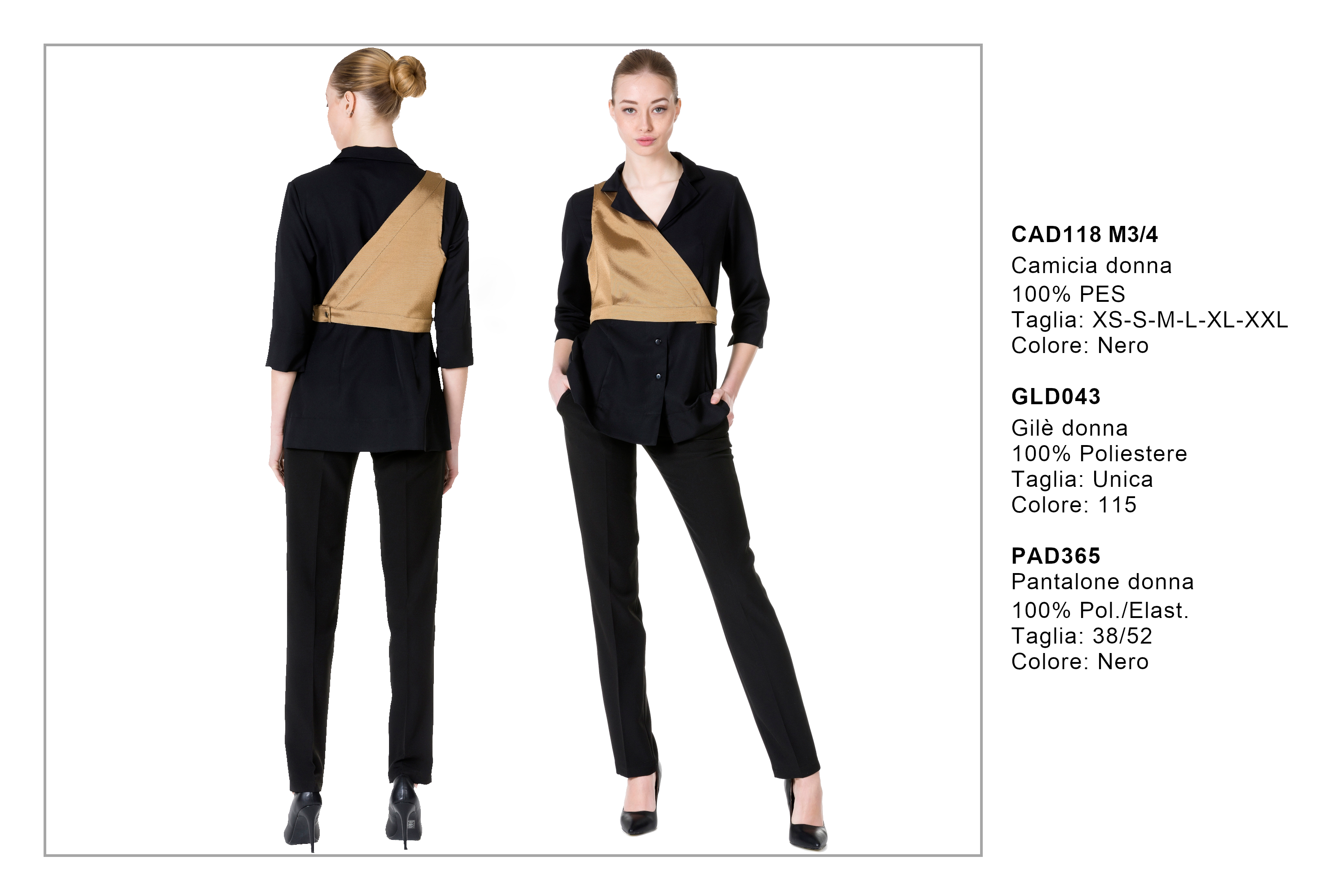 Maglia nera e gilet oro per cameriera. Un abbinamento insolito che rende unico il personale di sala.
